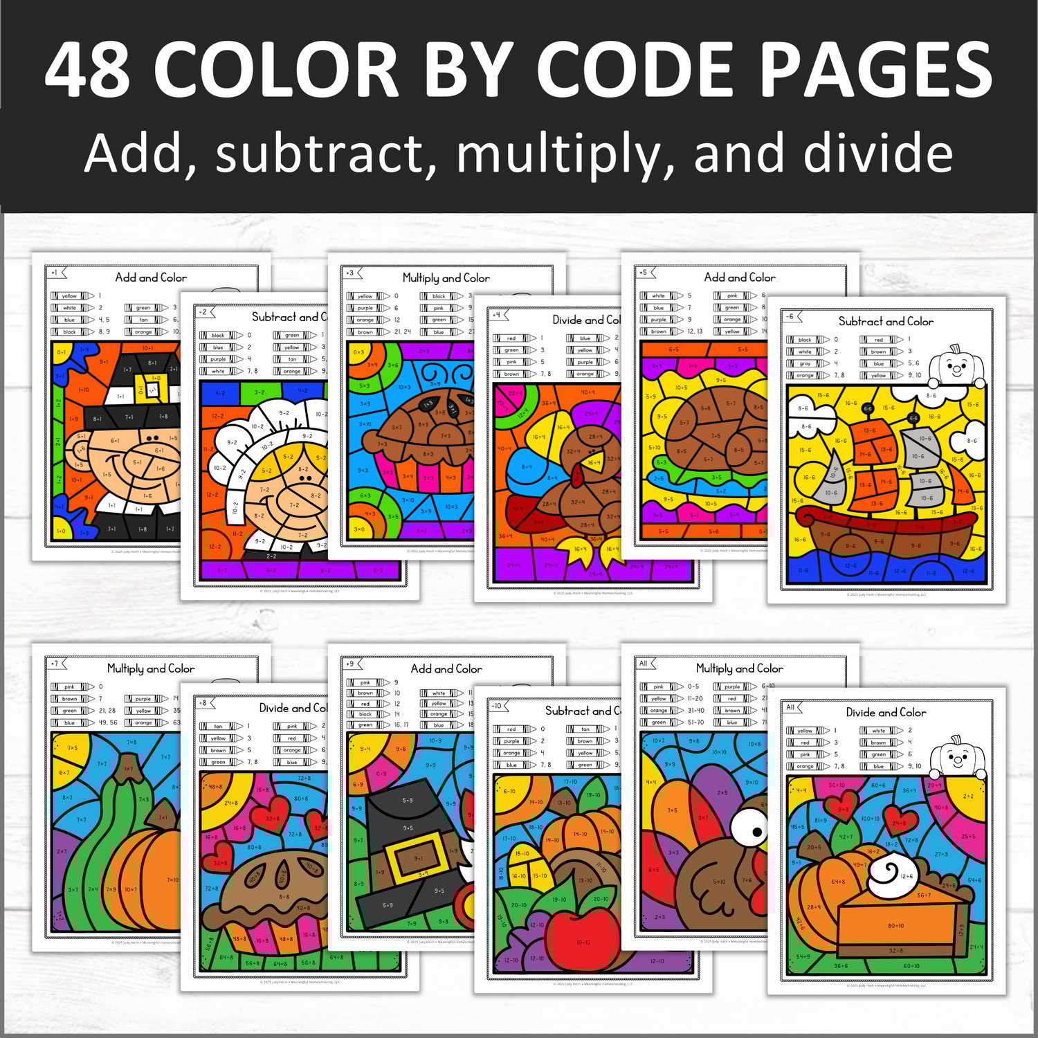Thanksgiving-themed bundle includes 4 sets of color by code worksheets: