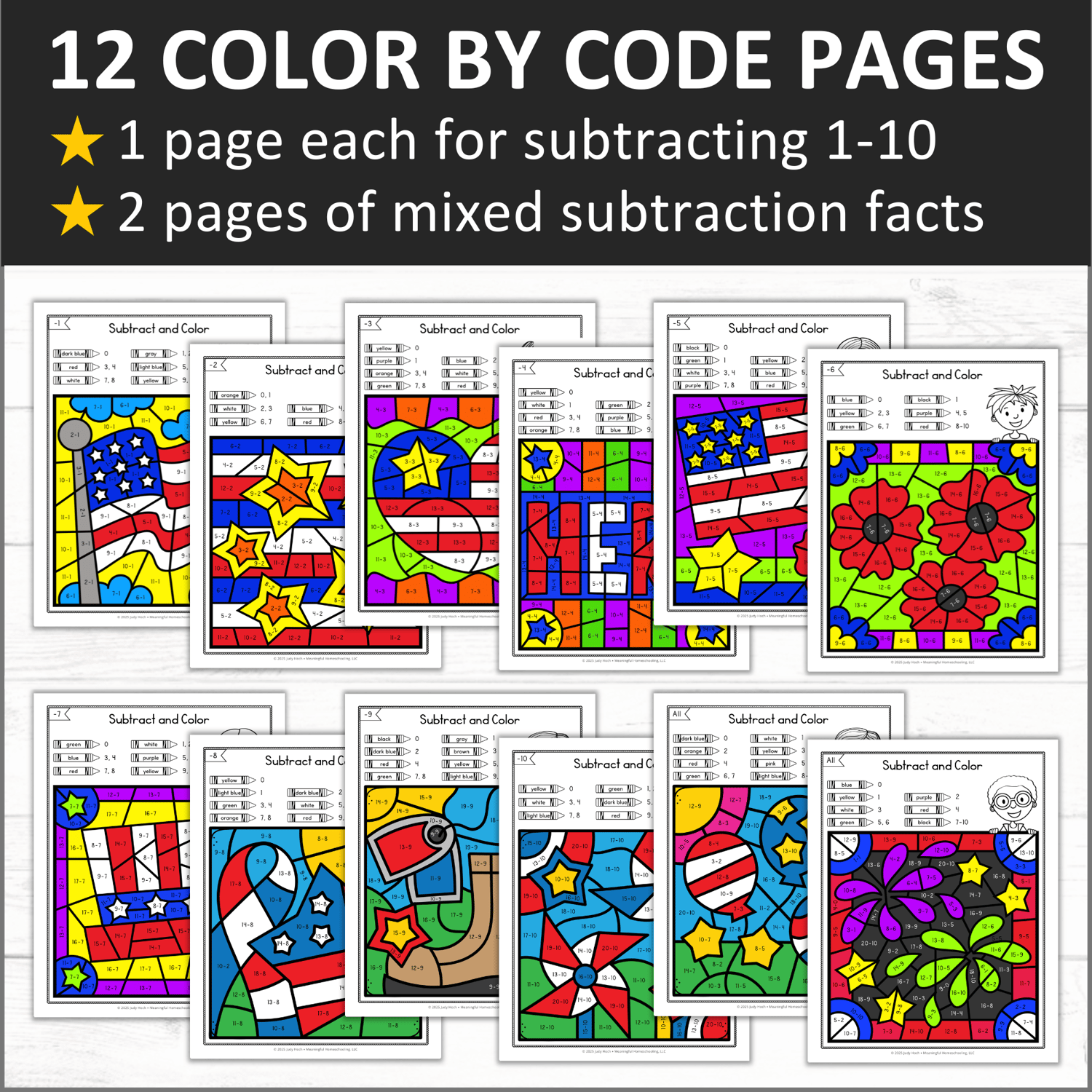 This set includes 12 color by code pictures, with one page each for subtracting 1, 2, 3, 4, 5, 6, 7, 8, 9, and 10. There are also 2 pages of mixed subtraction facts. Use the worksheets for reinforcement/review or to target specific facts that students may be struggling with.