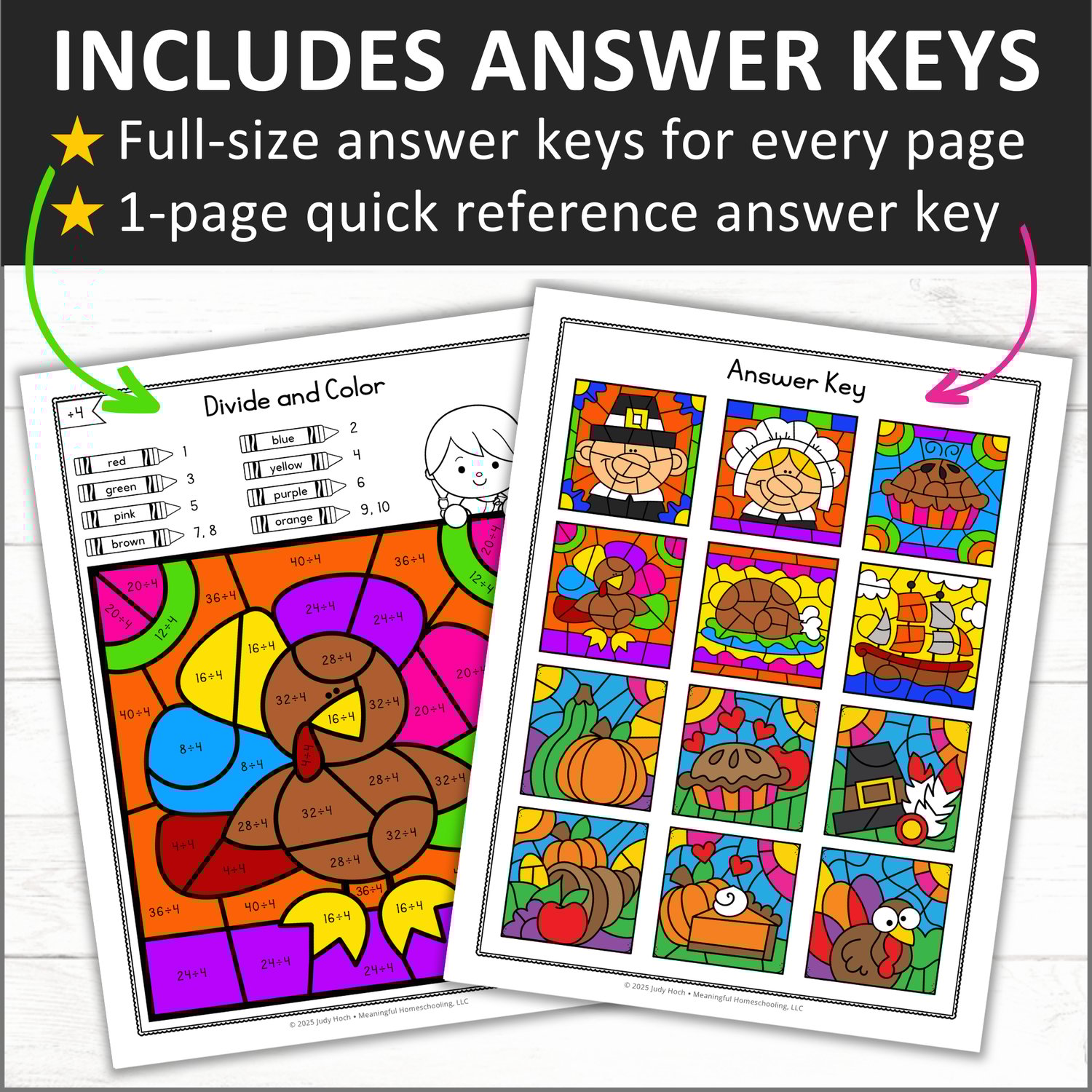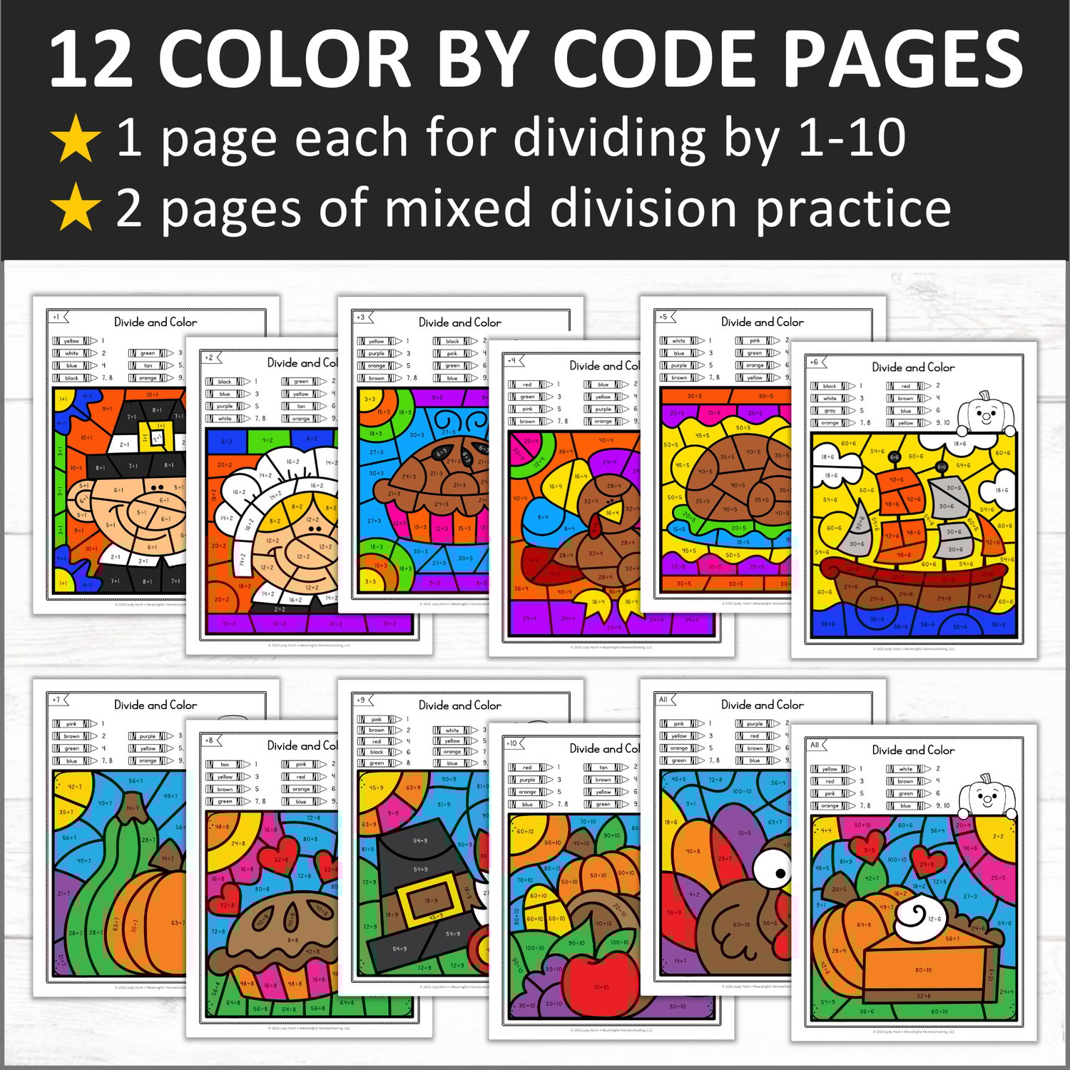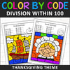 Practice division within 100 with these fun Thanksgiving-themed color by code worksheets! These NO PREP math activities will help students master division facts while coloring by code.