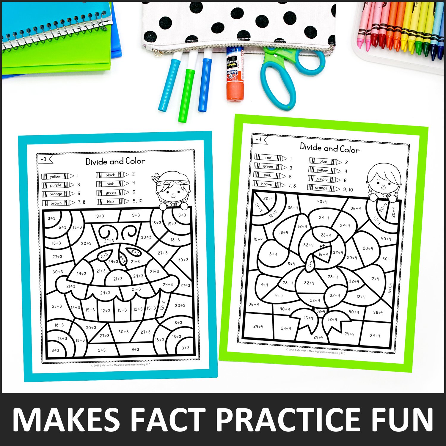 This set includes 12 color by code pictures, with one page each for dividing by 1, 2, 3, 4, 5, 6, 7, 8, 9, and 10. There are also 2 pages of mixed multiplication facts. Use the worksheets for reinforcement/review or to target specific facts that students may be struggling with.
