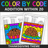 Practice addition within 20 with these fun Thanksgiving-themed addition color by code worksheets! These NO PREP math activities will help students master addition facts while coloring by code.
