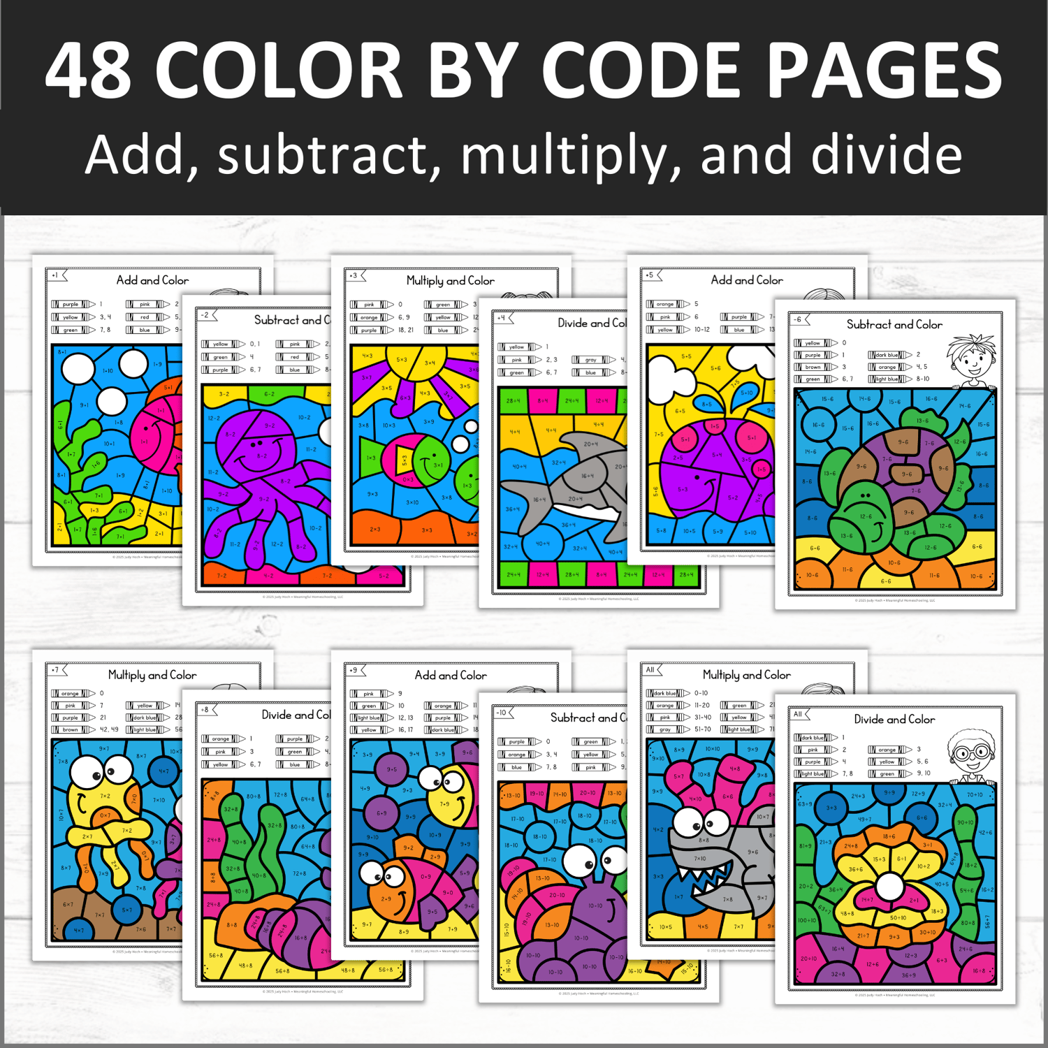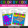 Ocean-themed bundle includes 4 sets of color by code worksheets: