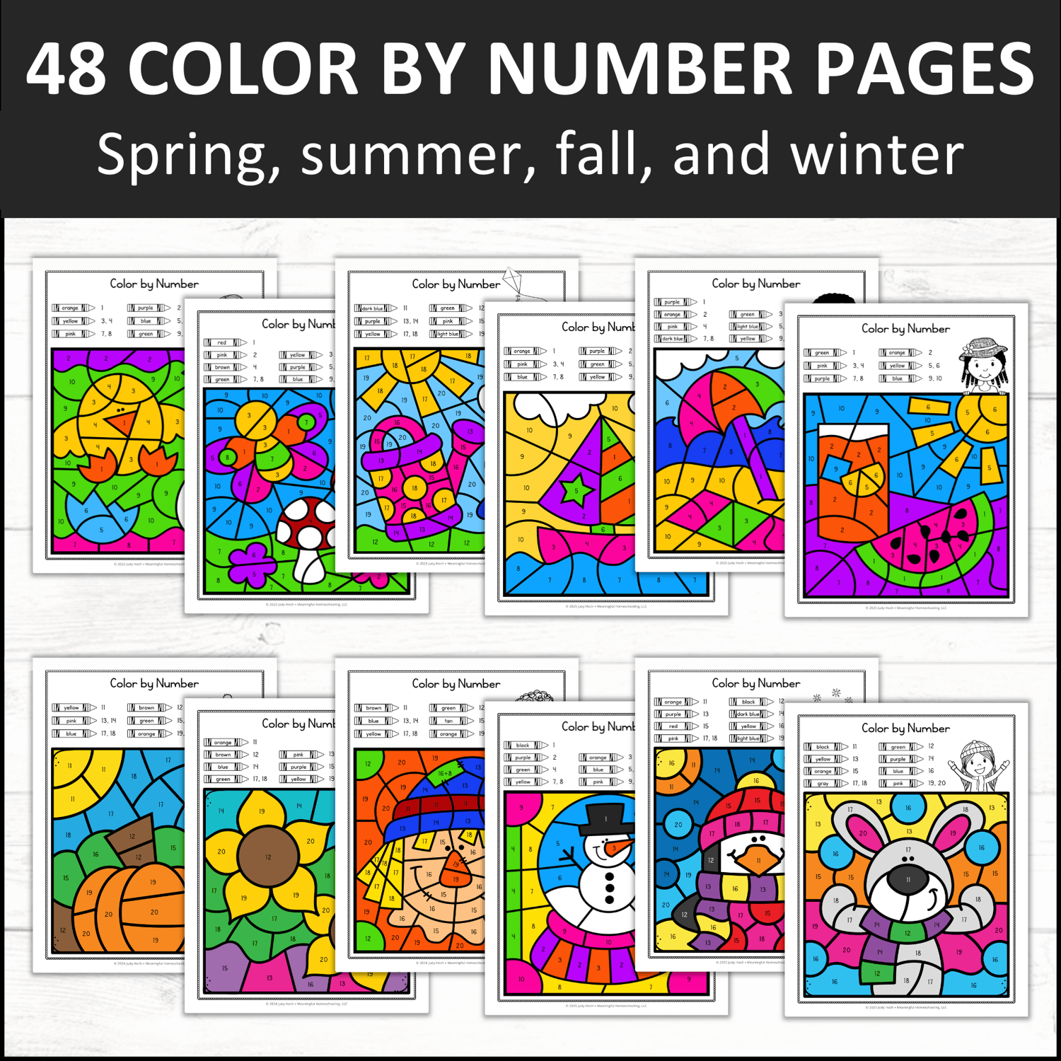 Seasons-themed bundle includes 4 sets of color by number worksheets: