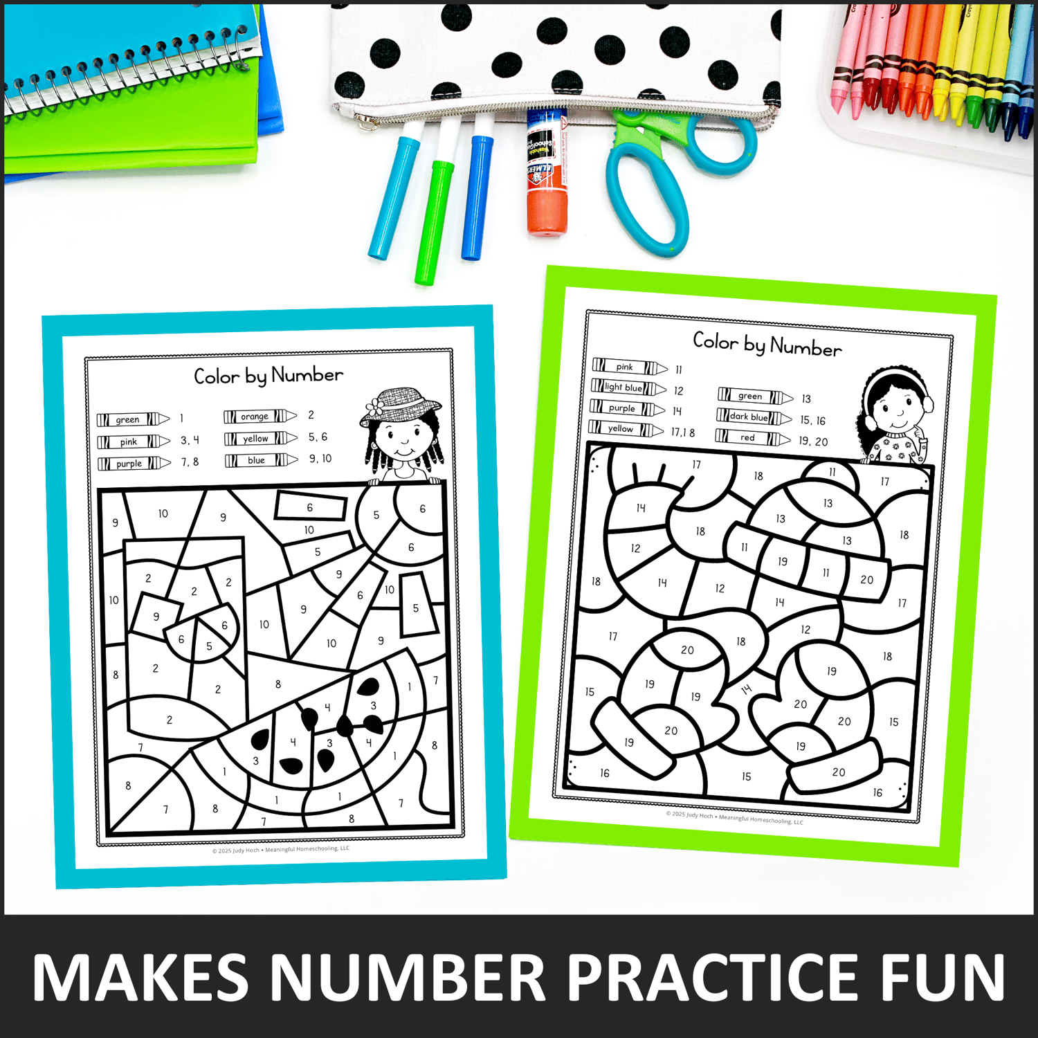 Each set includes 12 color by number worksheets, with 6 pages for numbers 1-10 and 6 pages for numbers 11-20.