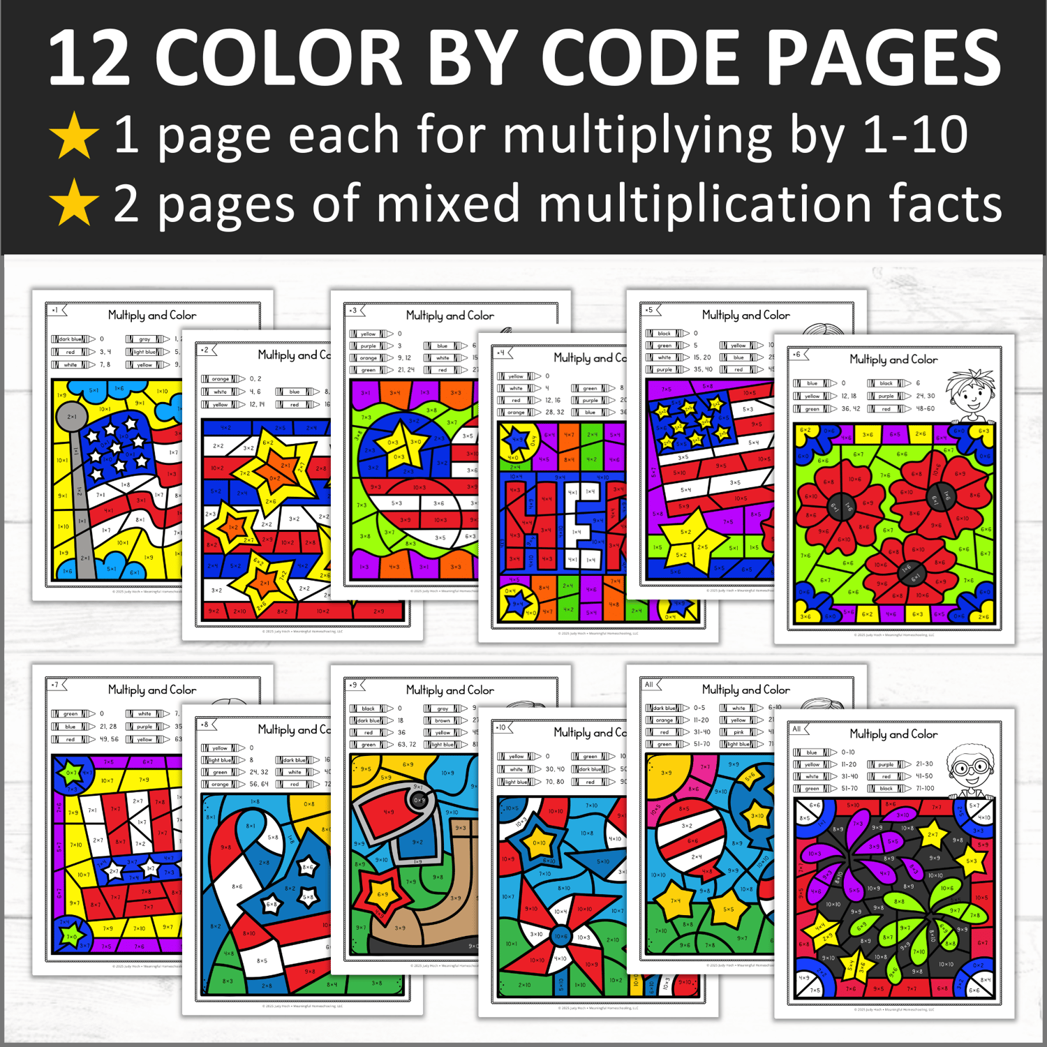 This set includes 12 color by code pictures, with one page each for multiplying by 1, 2, 3, 4, 5, 6, 7, 8, 9, and 10. There are also 2 pages of mixed multiplication facts. Use the worksheets for reinforcement/review or to target specific facts that students may be struggling with.