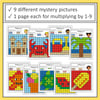 This set includes 9 different mystery picture printables, with one page each for multiplying by 1, 2, 3, 4, 5, 6, 7, 8, and 9. Use the worksheets for reinforcement/review or to target specific facts that students may be struggling with.