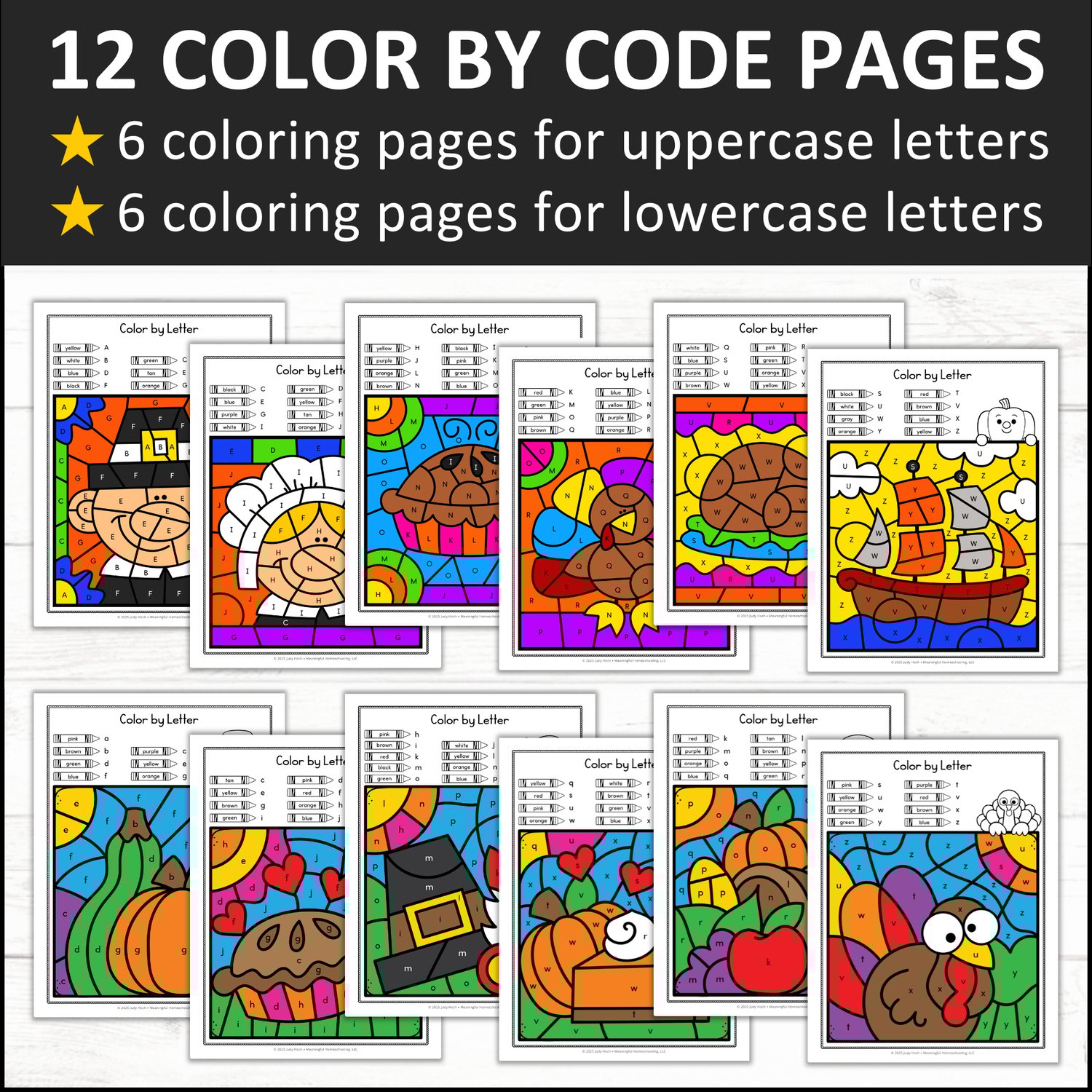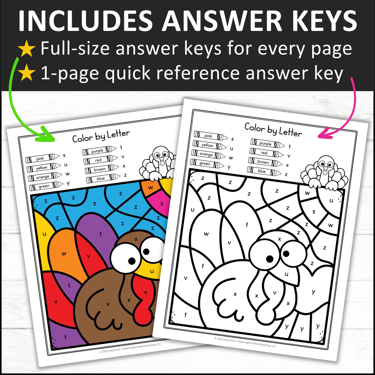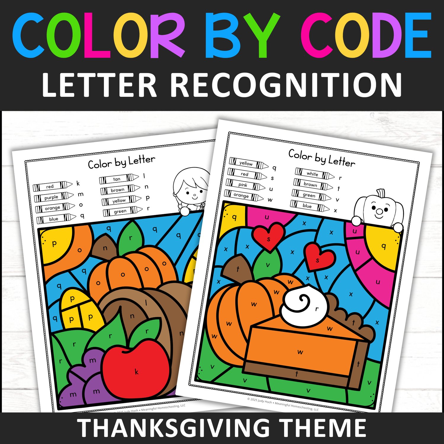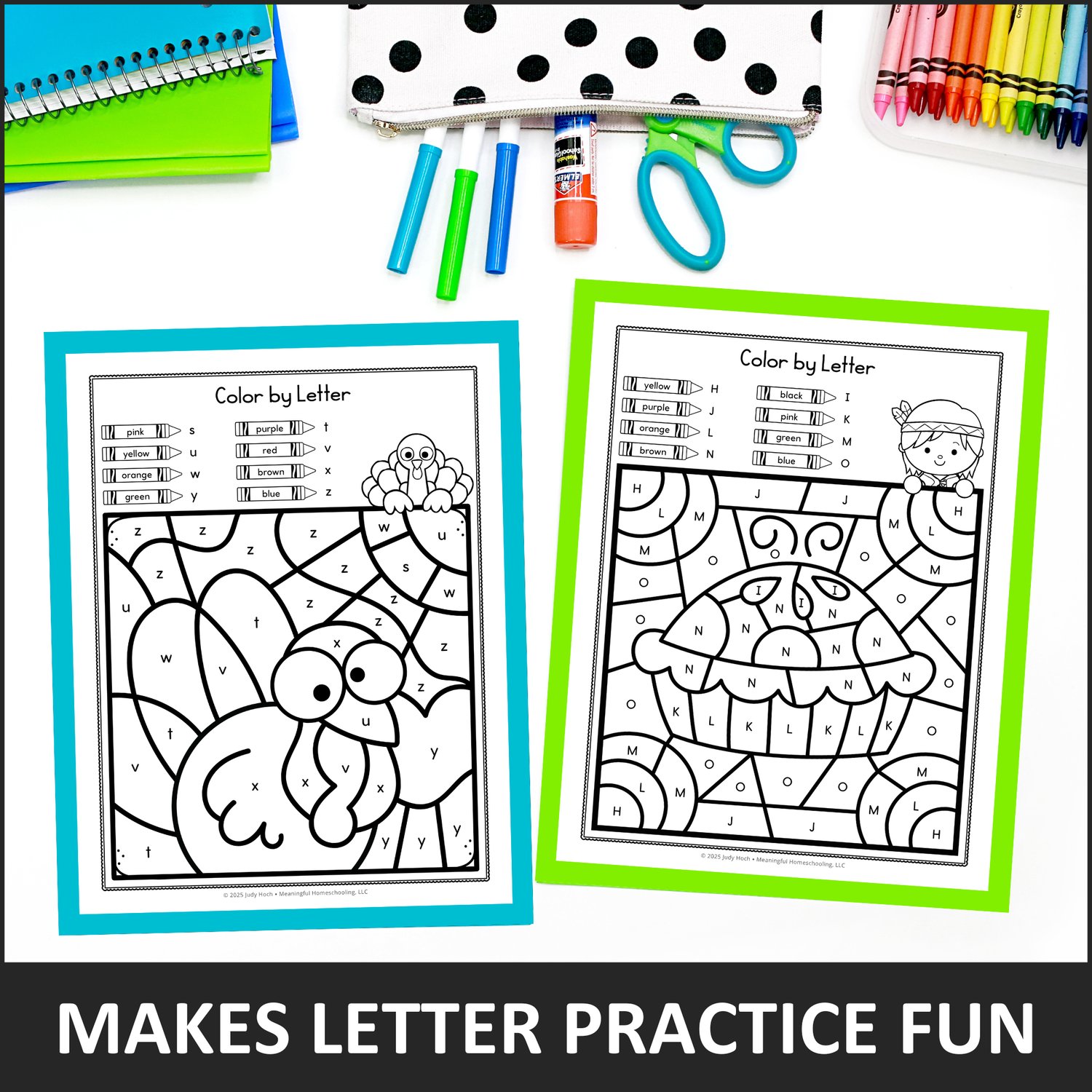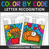 Practice letter recognition with these fun Thanksgiving-themed color by letter worksheets! These NO PREP math activities will help students practice recognizing letters while coloring.